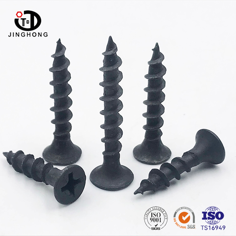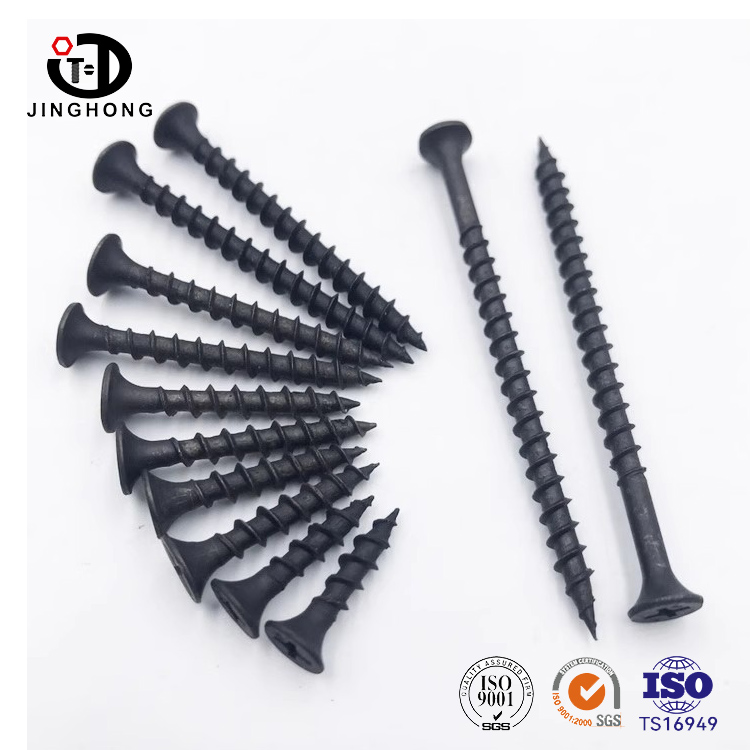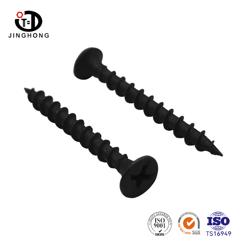 Высокопрочные винты JINGHONG для гипсокартона с черной потайной головкой, специально разработанные для установки гипсокартона, изготовлены из бытовой стали и имеют черное антикоррозионное покрытие. Винт быстро вкручивается, имеет высокую силу зажима и долговечность, подходит для крепления легкого стального киля, деревянного киля и различных строительных материалов.