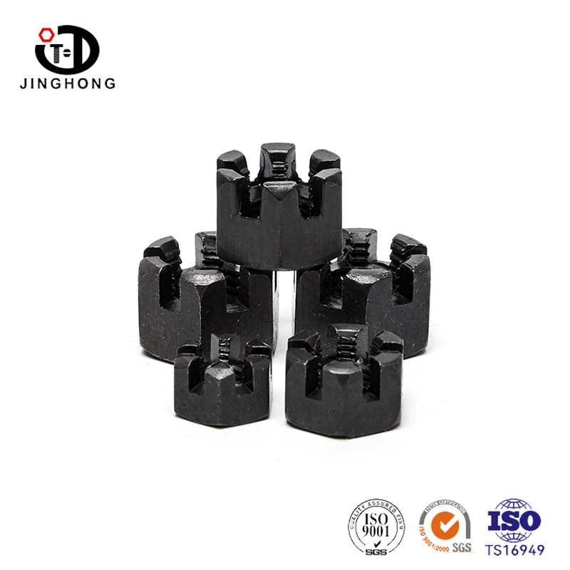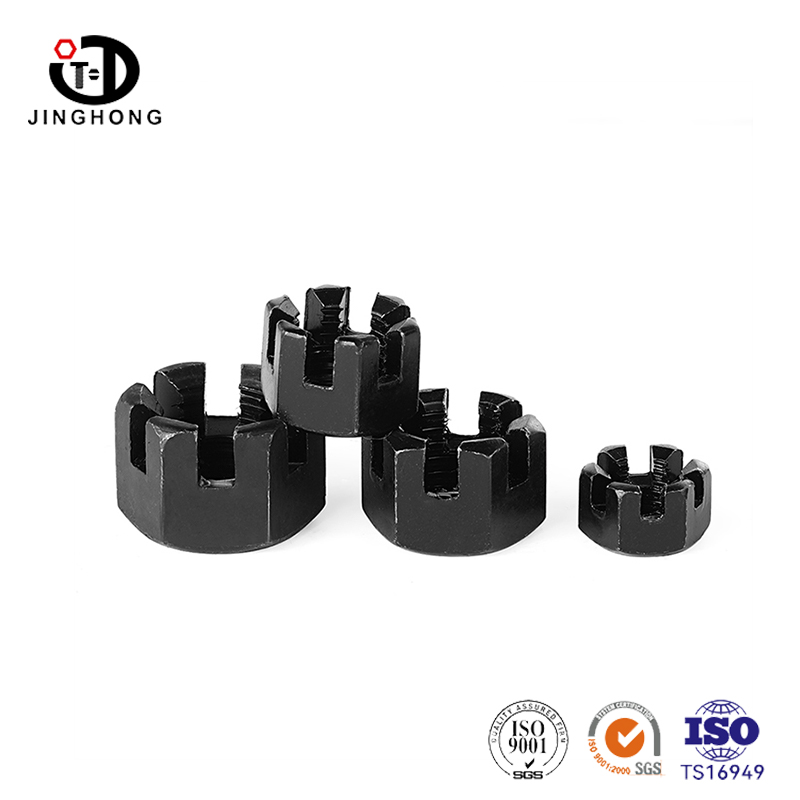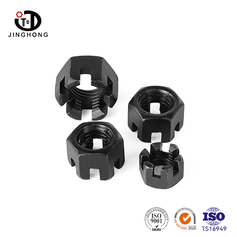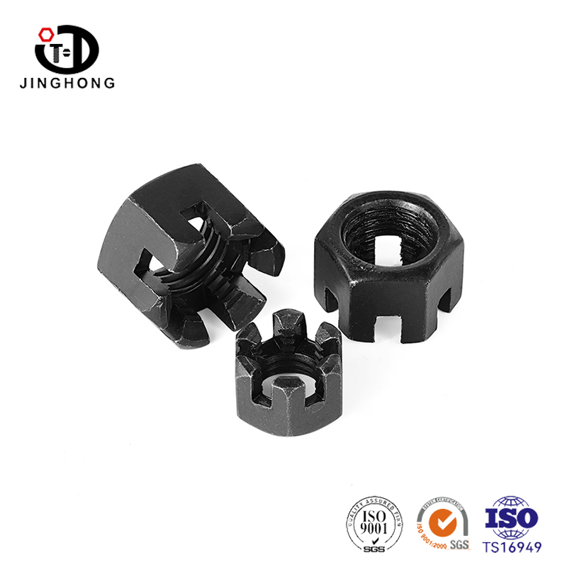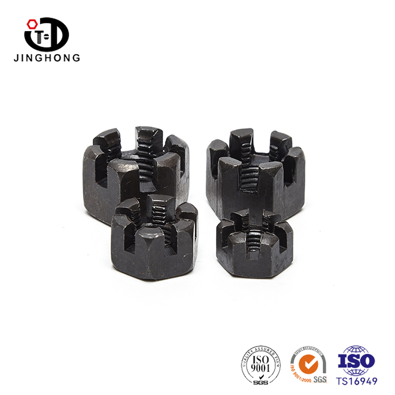 Обычно это высокопрочная сталь, которая была тепловой обработкой, чтобы придать ей вязкость, а также прочность, твердость и стойкость к износу. Они сильны, жесткие, жесткие, могут нести тяжелые грузы и высокий крутящий момент и остаются надежными в жестком обслуживании, длится дольше. Гексная форма является стандартной, простой в установке и удалении со стандартными ключами. Конструкция с слотом для верхней части требует разделенного штифта - после того, как вы затягиваете гайку, вы вставляете штифт через отверстие для болта и прорези в гайку, затем сгибайте концы штифта, чтобы заблокировать все на месте. Этот дизайн не дает гайке от ослабления из -за вибрации или шока, что делает все это более безопасным.