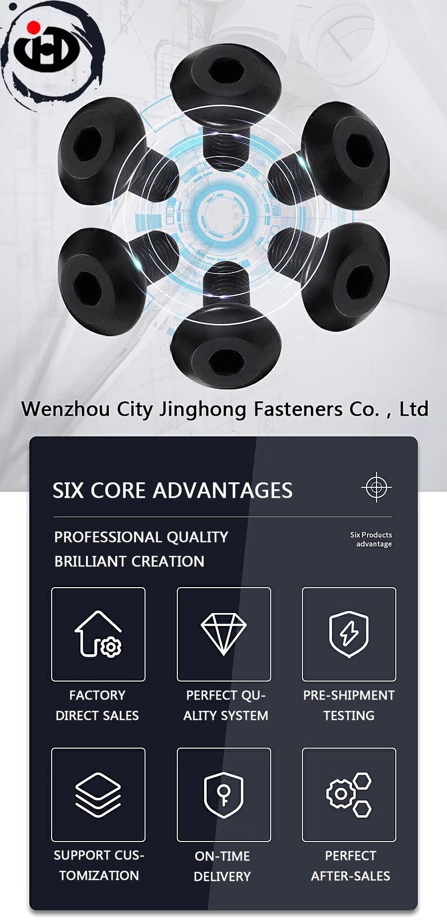 Jinghong специализируется на производстве крепежных изделий из высококачественной легированной и нержавеющей стали. Мы используем точный процесс холодной высадки и процесс пассивации поверхности для нашей продукции. Они могут хорошо работать в экстремальных условиях. Мы предлагаем комплексные решения: от обычных креплений до индивидуальных креплений. Существуют определенные диапазоны, которые можно настроить для параметров резьбы и формы компонента. Продукция используется в широком спектре отраслей промышленности: от потребительских товаров до крупных промышленных машин.