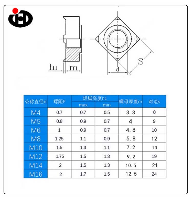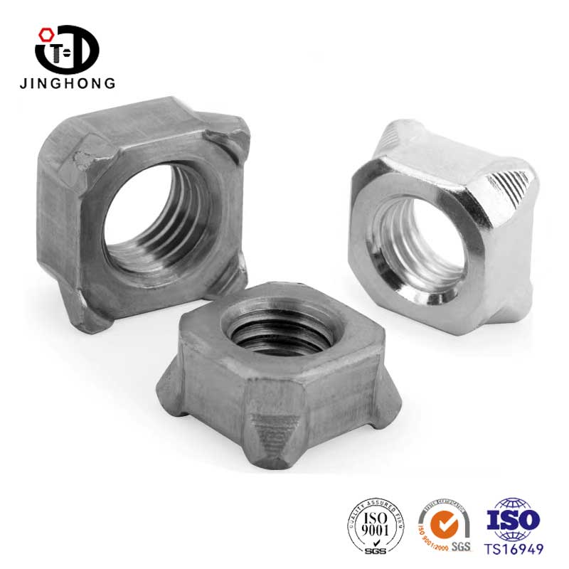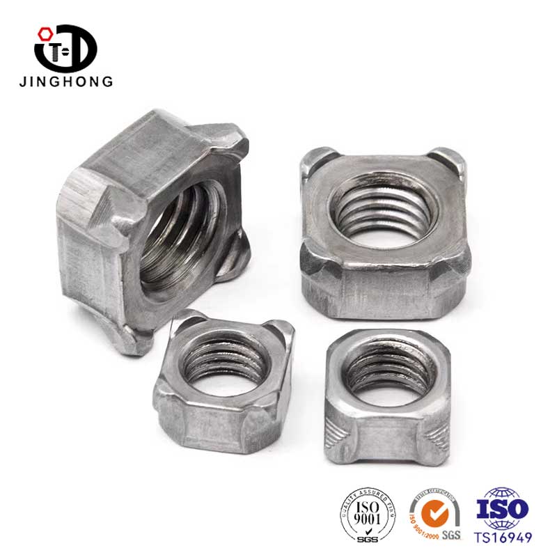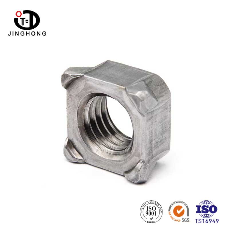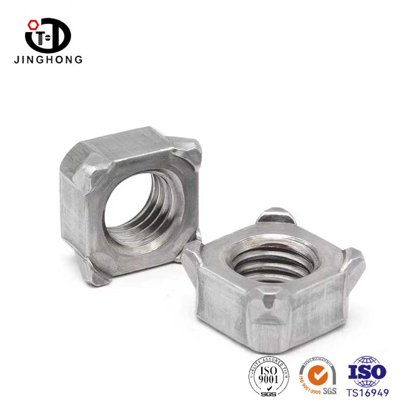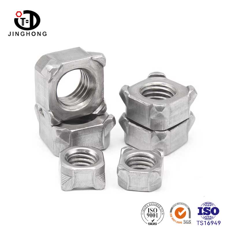 По сравнению с традиционным методом сборки, заключающимся в сверлении отверстий в плате и нарезании резьбы на болтах и гайках, приваренные гайки образуют прочное металлургическое соединение в зоне сварки посредством профессиональных сварочных процессов. Это делает прочность резьбы независимой от толщины пластины и позволяет выдерживать более высокие растягивающие и скручивающие силы. Ее стандартная квадратная форма имеет два ключевых преимущества: во-первых, она предотвращает вращение гайки во время сварки и последующих процессов затяжки, обеспечивая точное позиционирование; Во-вторых, необходимо обеспечить четыре широких сварочных выступа или сварочных заусенца, что значительно увеличивает площадь сварочного контакта, тем самым обеспечивая прочность соединения и сопротивление кручению, намного превышающие показатели круглых сварочных гаек.